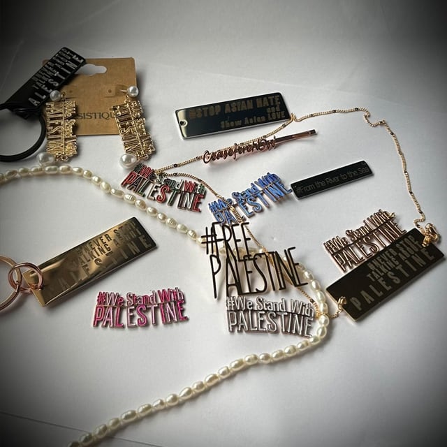 片面に「#DON'T STOP TALKING ABOUT PALESTINE」、もう片面に「#NeverStopTalkingAboutPALESTINE」の文字列をレーザー刻印で施した両面刻印のRÉSISTIQUEオリジナルパーツです。