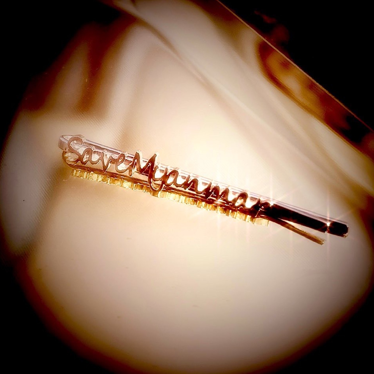 「ミャンマーを救え」のメッセージが象られたモチーフのヘアピンです。